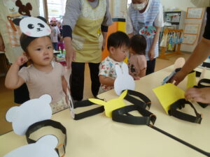 幼児クラスは、ばら、きく、ゆりぐみ5~6人の縦割りグループで相談しながら回り遊びました。最初は自分のやりたいものを優先し、グループが迷子になる場面もありましたが、みんな揃っていますか?と聞かれると、 友だちを呼んで集まり、どれを先にするか話をし、みんなの意見がまとまることができました!各クラスに戻ってからも、「さかないっぱいつれた」「おめんなにした?」と友だちと大盛り上がりでした!