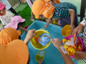 当日、室内では、ボール投げや輪投げ、魚釣りに金魚すくい、テラスでは、氷遊びやアヒルすくい、ヨーヨー釣りを楽しみました。