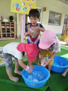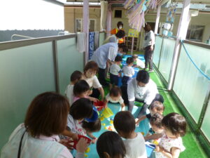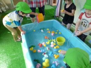 当日、室内では、ボール投げや輪投げ、魚釣りに金魚すくい、テラスでは、氷遊びやアヒルすくい、ヨーヨー釣りを楽しみました。