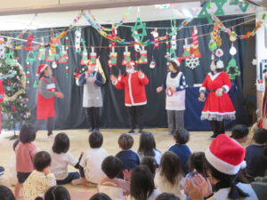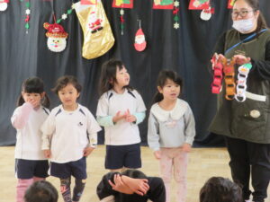 保育士の出し物では、クリスマスにちなんだクイズに答えるペープサートを見ました。難しかったけれど、さすが幼児クラスの子どもたちは、答えを当てていましたよ☆