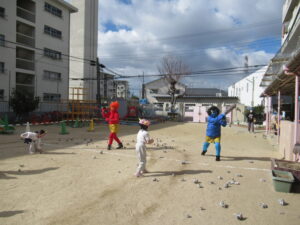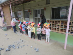 幼児の豆まきは、門から赤鬼、青鬼が登場。鬼がきたー!とみんな、いきよいよく「オニハ~ソト」と言って豆を投げていました。なかには、涙をこらえて担任の後ろに隠れたりする子もいました。子どもたちは由来の話の中で、鬼が来ても泣かずに豆を投げて、自分の心の中にいてる悪い鬼を追い払おうとしていたので、どの子もしっかりと豆を投げていました。みんなの力はひとつになり、見事鬼は、逃げて帰っていきました。ばんざーい。