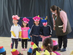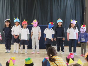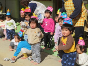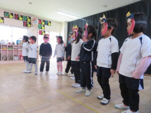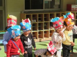 2月3日は、節分お楽しみ会でした。各クラス、折り紙やお花紙、毛糸などの素材を使いユニークな鬼がいっぱいできました。どの子も嬉しそうにかぶって参加していましたよ。