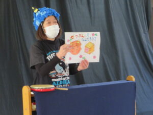 最初は、節分の由来はを乳児クラスの子もわかりやすいように紙芝居で伝えました。
