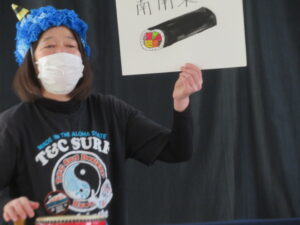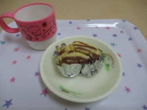 給食は鬼の顔のご飯と金棒ハンバーグ おやつは鬼のパンツの蒸しパン