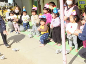 乳児クラスの豆まきは、5歳児のゆり組さんが鬼になって登場!「オニハ~ソト」と小さな手で豆を握りしめてなげていましたよ。