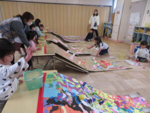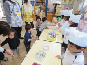 2月21日(木)にお店屋さんごっこをしました。この日の為に、幼児さんはみんなで相談をしてお店を決めました。お店屋さんの準備でいろんなものを作り始めていくなかで、アイデアを盛り込んだ作品ができ、だんだんお店屋さんごっこに向けての期待が高まっていきました。