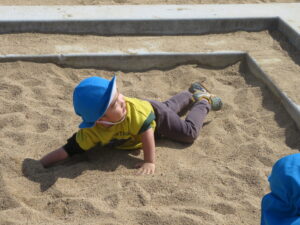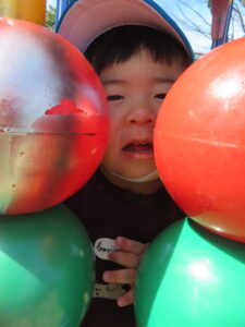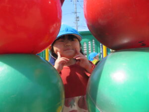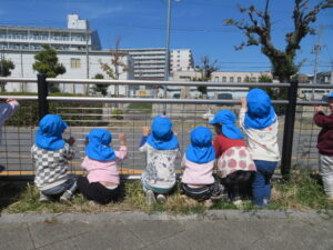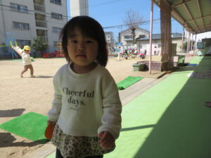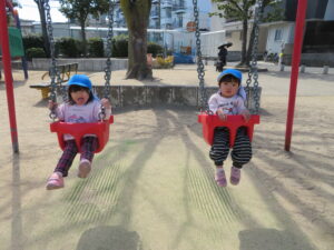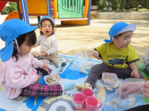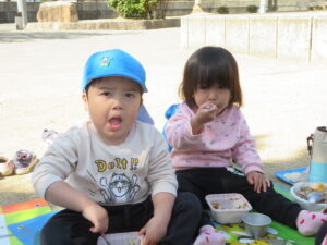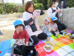 公園に着くと疲れていないか心配しましたが、すぐに遊具で遊び始め、子どもたちの体力のすごさに驚かされました。この1年で本当に体も心も成長しましたね。公園に着くと、危険がないか保育士が確認するのですが、子どもたちに「お座りしましょう~🎵」と歌いながら声をかけるときちんと座れる子どもたちに話もよく聞けるようになったなあと感心しました。