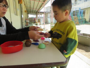 前日のお菓子屋さんでは、お菓子とおもちゃの食べ物が置いてあり、どれを買おうか迷ったり、すぐに玩具の食べ物を買っていったりとおもしろかったですよ。