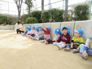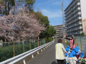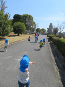 とてもよく晴れた3月17日にクラスのお別れ会としてお散歩遠足に行きました。初めて行った「瓜破東北公園」。とっても遠いので、いつでも避難者に乗れるように、用意して行きましたが、片道45分。全員にこにこでおしゃべりしながら歩きました。さくらがたくさん咲いていて、子どもたちとお花見もしながら歩きました。