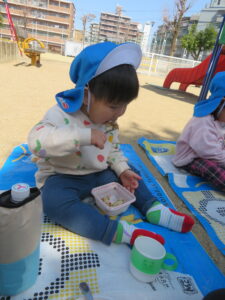 待ちに待ったお弁当タイム。牛丼を給食の先生が届けてくれたので、「おべんとう うれしいな🎵」と歌をうたって食べました。外で食べる給食弁当はいつも以上においしくてみんな大満足!!